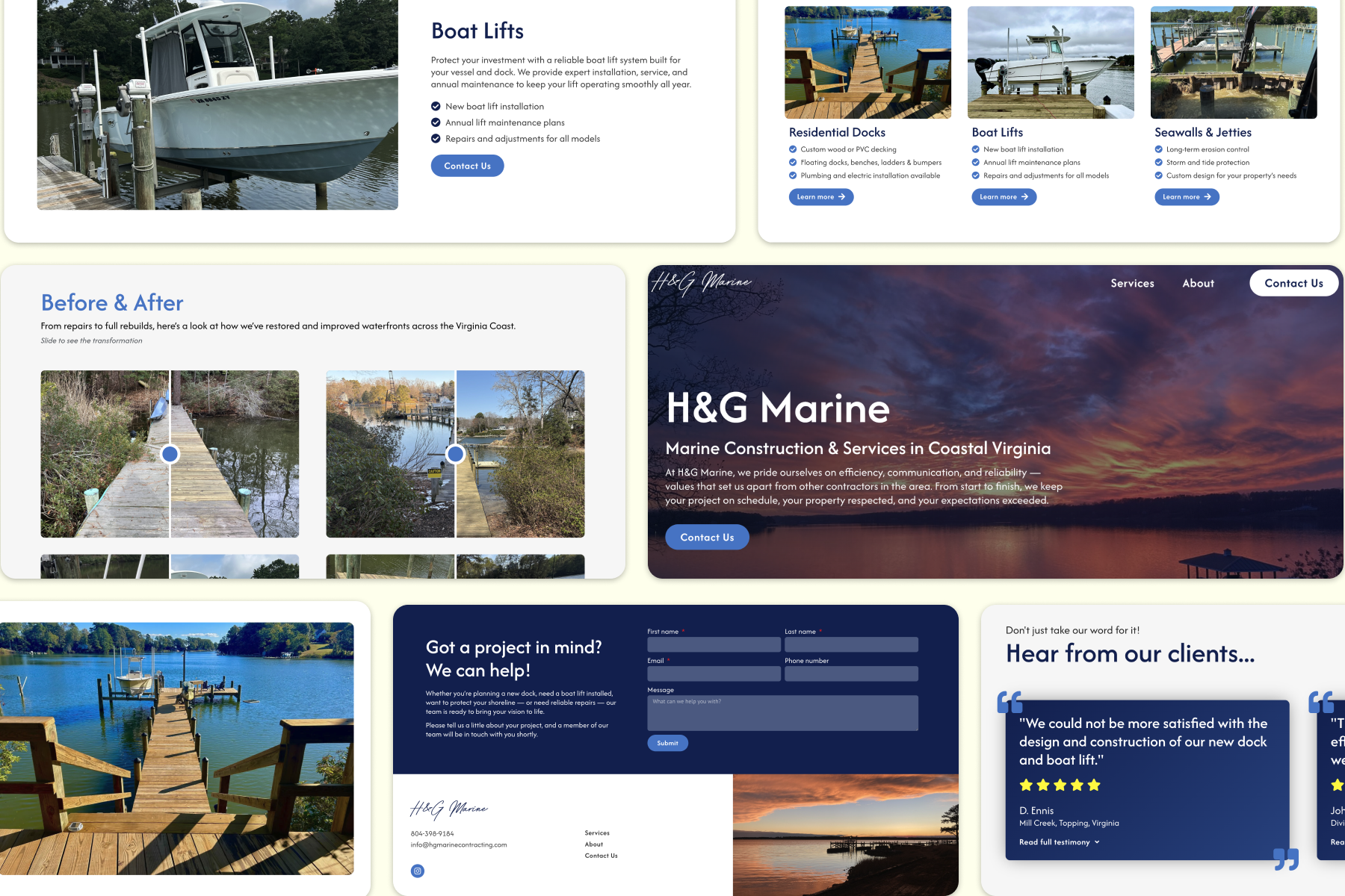 H&G Marine is a growing marine construction and services company based in Virginia. This project involved a full website redesign to elevate their online presence, clearly communicate their services, and showcase the quality of their work through strong visuals and real project examples.
